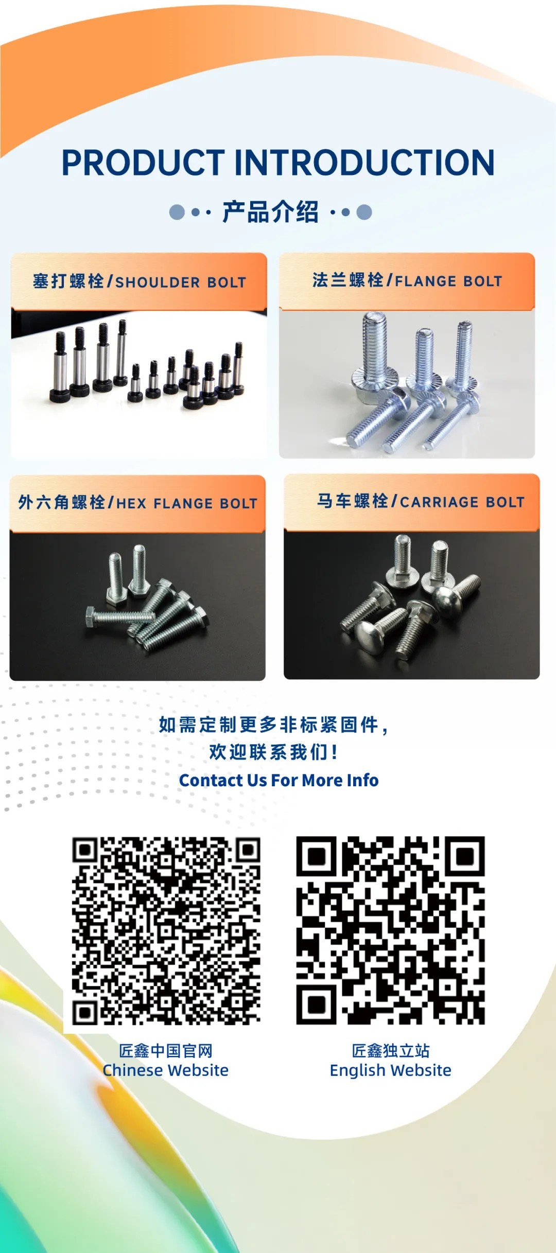 Rozsah podnikania: skrutky (vonkajšie šesťhranné skrutky, vnútorné šesťhranné skrutky, vozíkové skrutky, prírubové skrutky atď.), skrutky (strojové skrutky, vŕtacie skrutky, nastavovacie skrutky, hmoždinky triedy 12,9, šesťhranné skrutky do dreva, samorezné skrutky), matice (šesťhranné matice, K-klobúčiky, nylon, lisované kovové samoistiace matice, šesťhranné prírubové matice, prevlečné matice, série nitovacích matíc atď.), iné (polduté nity, stupňovité nity a rôzne neštandardné spojovacie prvky).